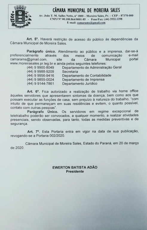 A portaria de nº 011/2020 da Câmara Municipal de Moreira Sales vai autorizar a volta da presença de munícipes que queiram acompanhar as sessões no auditório da casa legislativa. A portaria frisa ainda que será permitida apenas 30% da capacidade máxima do auditório onde são realizadas as sessões, em atendimento as recomendações de distanciamento. Não será permitido a entrada de qualquer pessoa sem o uso da máscara de proteção.