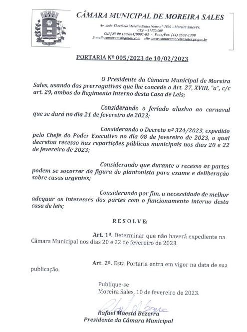 Portaria n° 005/2023 - Recesso no feriado de Carnaval 2023